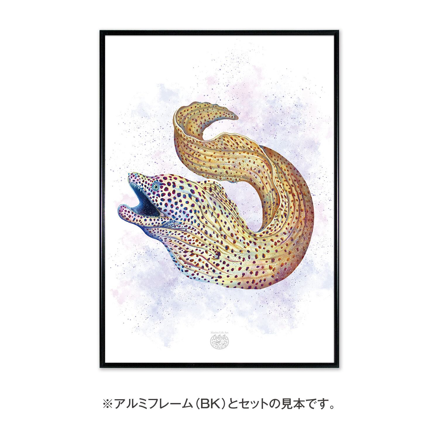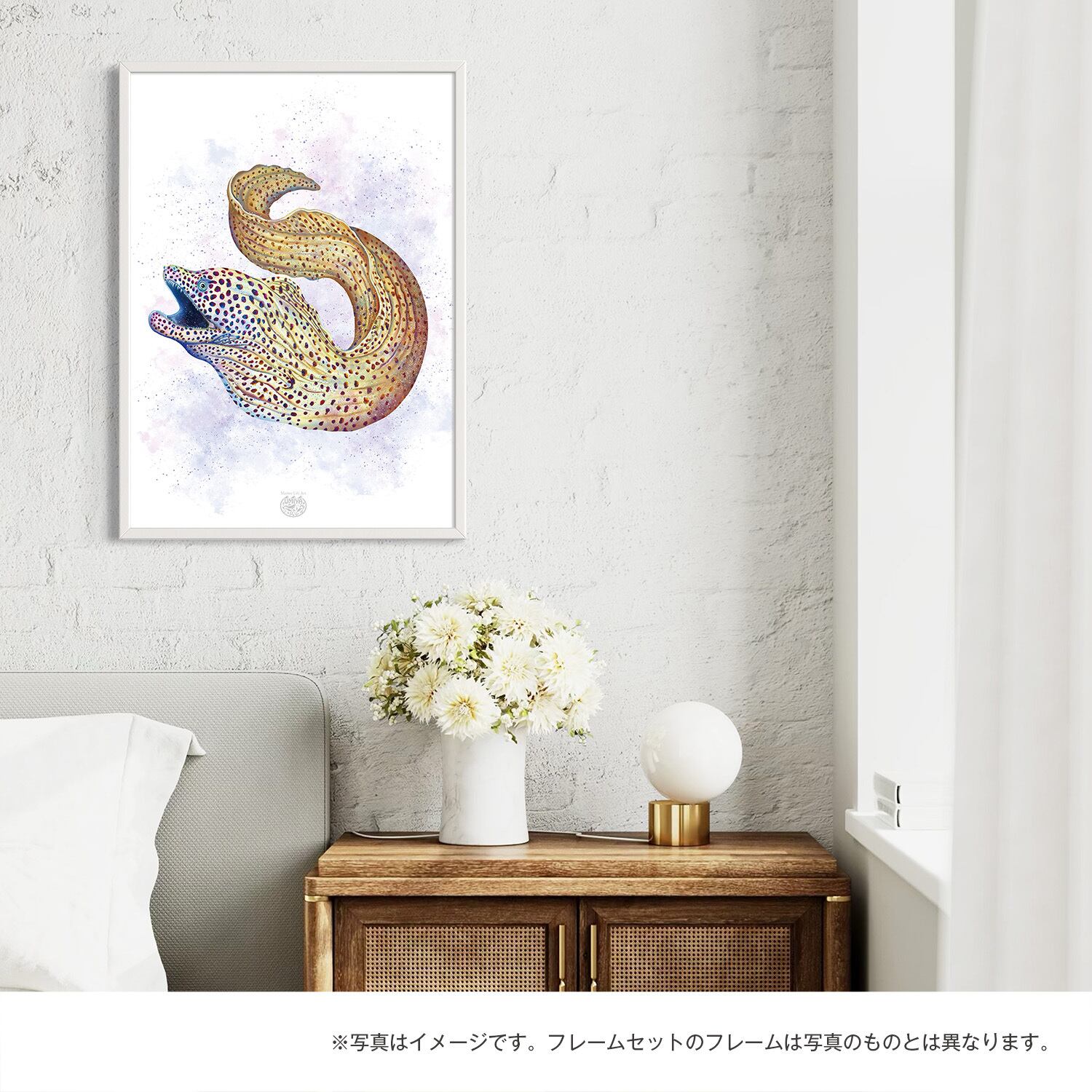 ニセゴイシウツボを描いた、お魚アートポスターです。 海やアートを身近に感じたい方のインテリアにぴったりの一枚。 リビングや書斎、ベッドルームなどの空間に、海の癒やしをそっとお届けします。 こちらの商品はポスター単体のみ、またはポスターとフレームとのセット購入からお選びいただけます。 オプションからサイズとフレームの色をお選びください。 フレームとのセット購入で付属されるフレームは、軽量で扱いやすく、縦横どちらでも飾れる仕様。 お部屋の雰囲気に合わせてホワイト/ブラックの2色から選択可能です。 ※商品画像はイメージのため、色味など実物とは多少異なります。 ※価格はサイズによって変動します。 【ポスター仕様】 ■材質 マット紙 ■サイズ A3:297mm × 420mm A2:420mm × 594mm A1:594mm × 841mm A0:841mm × 1189mm B2:515×728mm B1:728×1030mm B0:1030×1456mm 【フレーム仕様】 ■材質 アルミ製 ■付属品 ・吊りヒモ ・表面保護用PETフィルム ■本体サイズ/重量 A3:301mm×424mm/370g A2:424mm×598mm/590g A1:598mm×845mm/1100g A0:845mm×1193mm/2330g B2:519mm×732mm/820g B1:732mm×1034mm/1500g B0:1034mm×1460mm/3300g 【お届けについて】 ●商品は受注生産となっております。ご入金確認後8日〜15日程度(土日祝を除く)で発送致します。 ●年末年始、ゴールデンウィークなどの連休にご注文頂いた場合、通常より1週間程度のお時間を頂戴致します。 ●発送は工場からの直送になります。 ●お客様の都合によるご注文のキャンセル・返品・交換を承ることはできません。 ●当店で商品の到着日を指定する事はできません。宅配ボックスを利用するなどお客様でご対応お願い致します。