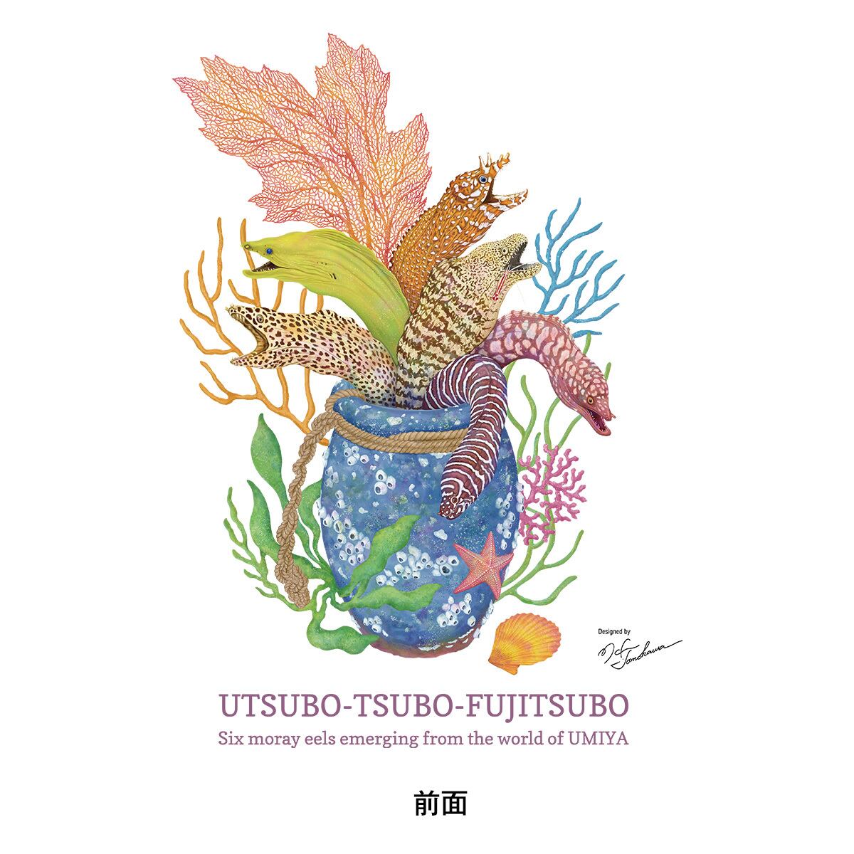 壺の中からひょっこり顔を出す6種類のウツボをプリントした半袖Tシャツです。
