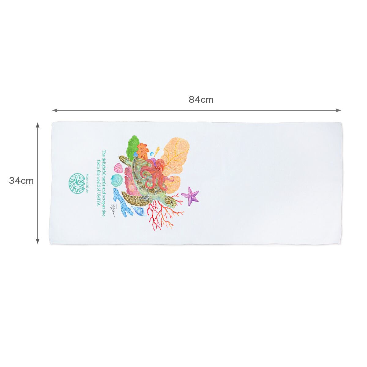 のんびり泳ぐウミガメの背中に乗ったタコの微笑ましいひととき。 心がゆるむ、癒しの海のワンシーンをプリントした、おしゃれでかわいいフェイスタオルです。 タオルの表面はサラッとしたフラット織りのポリエステル生地、裏面は肌触りのやさしいふんわりした素材を使用した2層構造です。 【素材】 ポリエステル95%、ナイロン5% 【サイズ(cm)】 84×34 【注意点】 ※写真はイメージのため実物の色味は多少異なります。