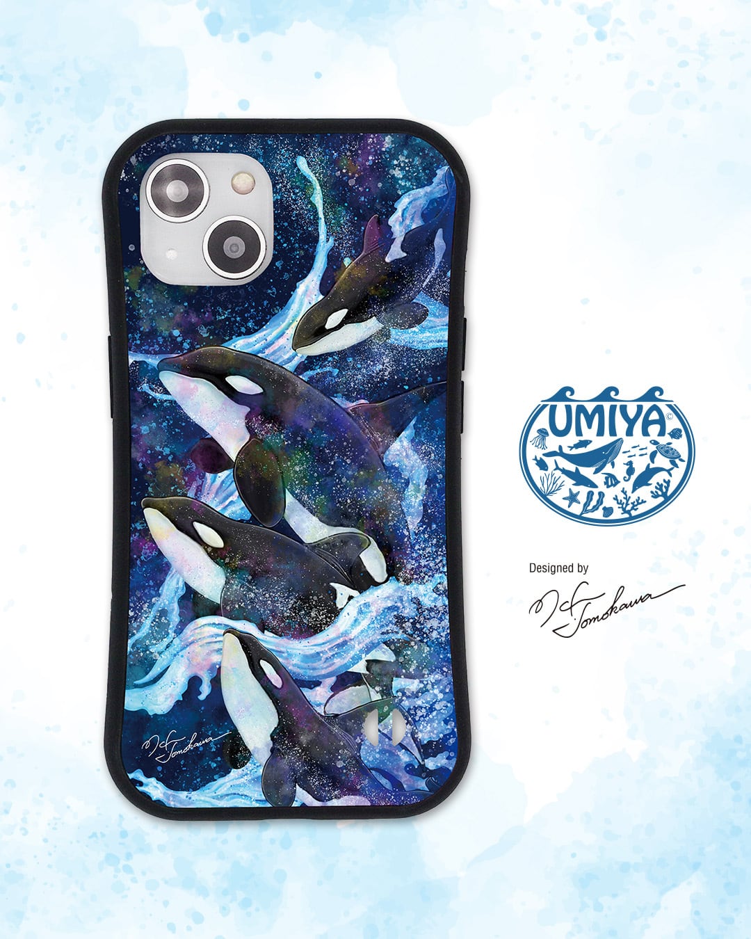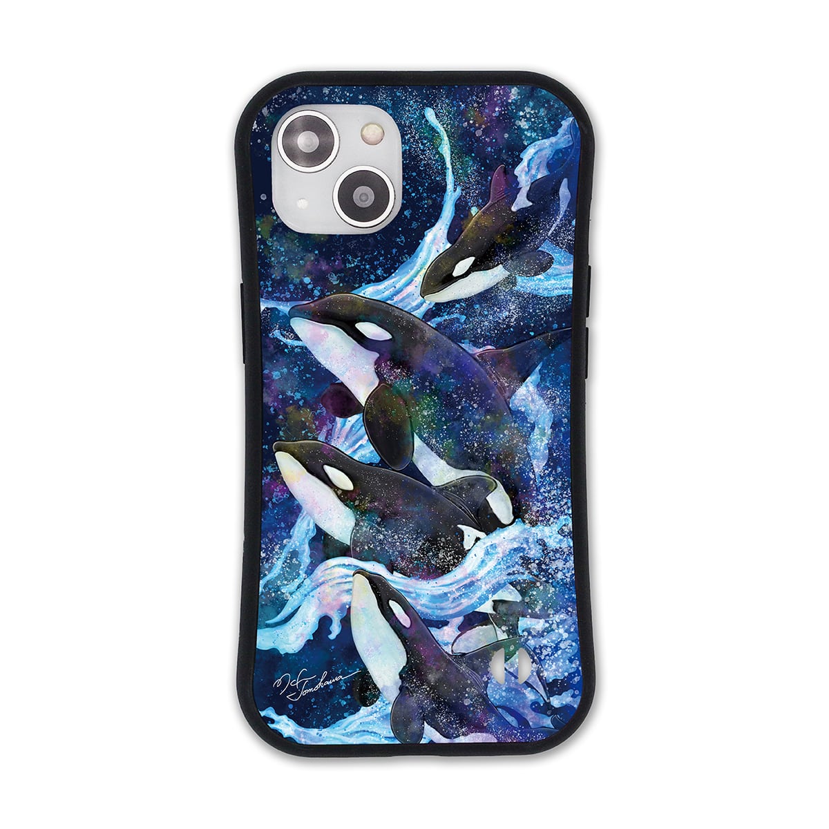夜の海を泳ぐシャチの家族を描いた、おしゃれな耐衝撃タイプのiPhoneケースです。