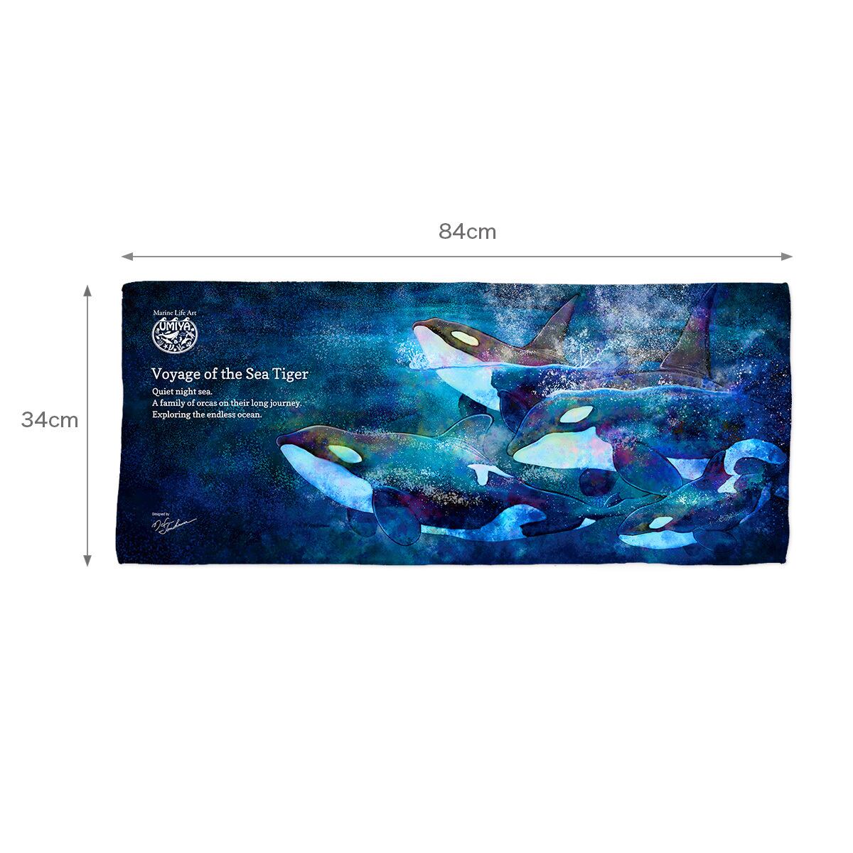 プレミアムアート作品『海虎航路』より、夜の海を泳ぐシャチの家族を描いた、おしゃれなフェイスタオルです。 日常でも海の神秘を感じられるフェイスタオルです。 タオルの表面はサラッとしたフラット織りのポリエステル生地、裏面は肌触りのやさしいふんわりした素材を使用した2層構造です。 【素材】 ポリエステル95%、ナイロン5% 【サイズ(cm)】 84×34 【注意点】 ※写真はイメージのため実物の色味は多少異なります。