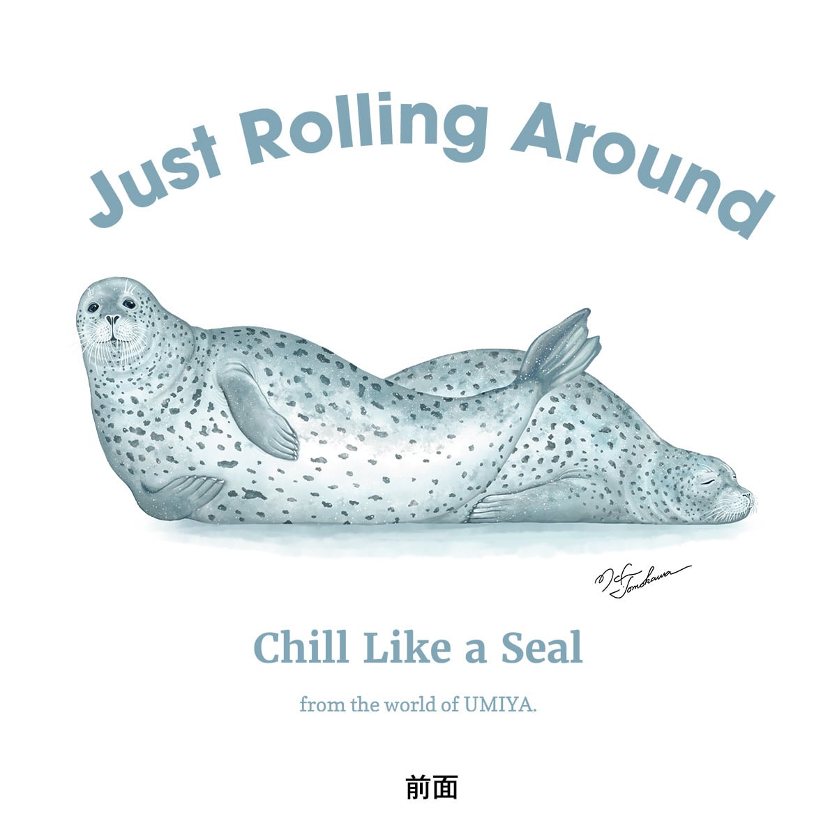 ころんと寝転がったゴマフアザラシをあしらったクルーネックスウェット(トレーナー)です。