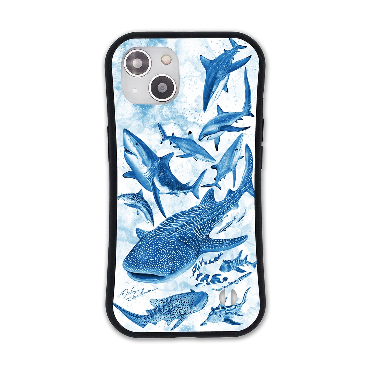 さまざまなサメたちが集う海の情景を描いたiPhoneケースです。