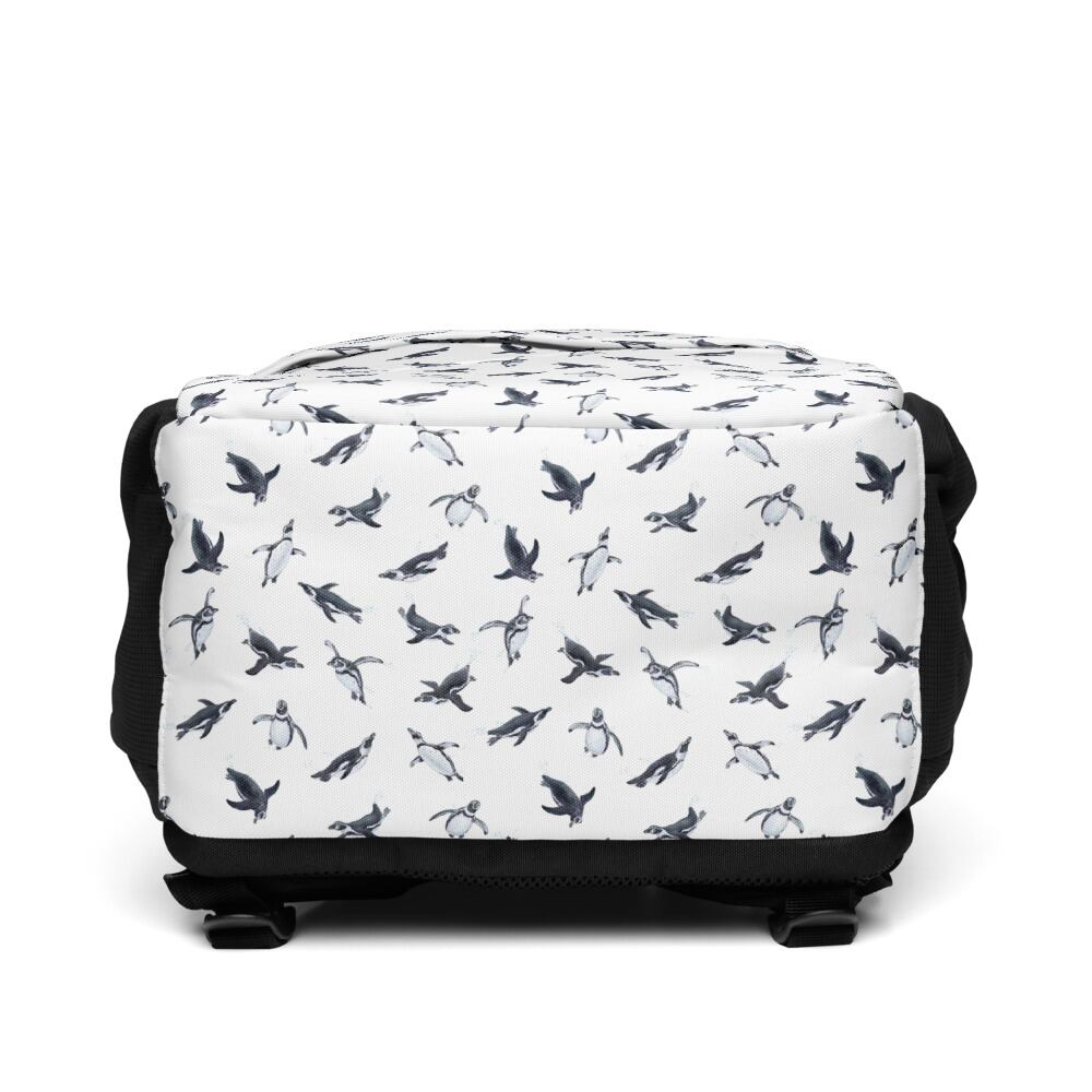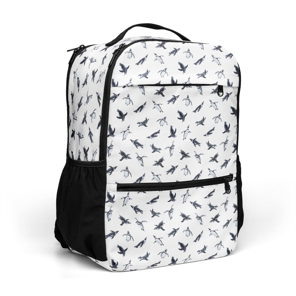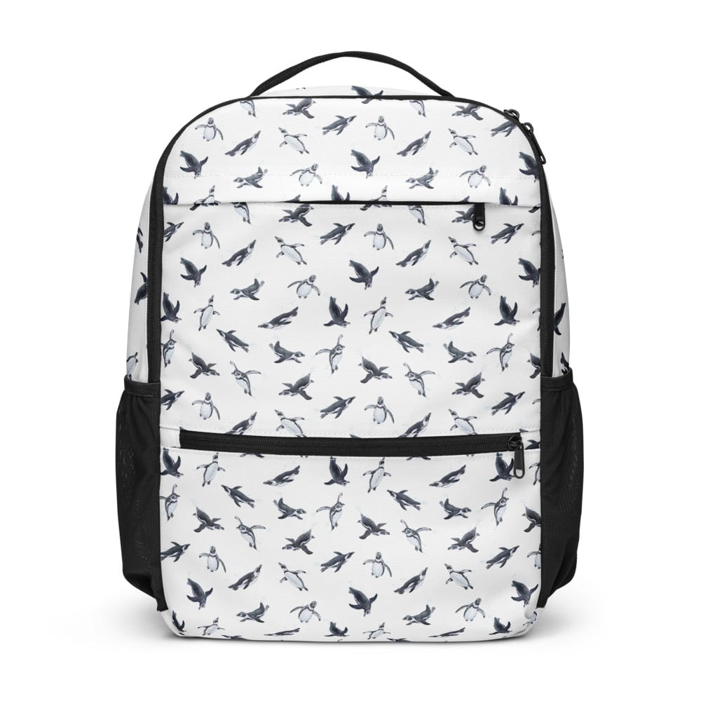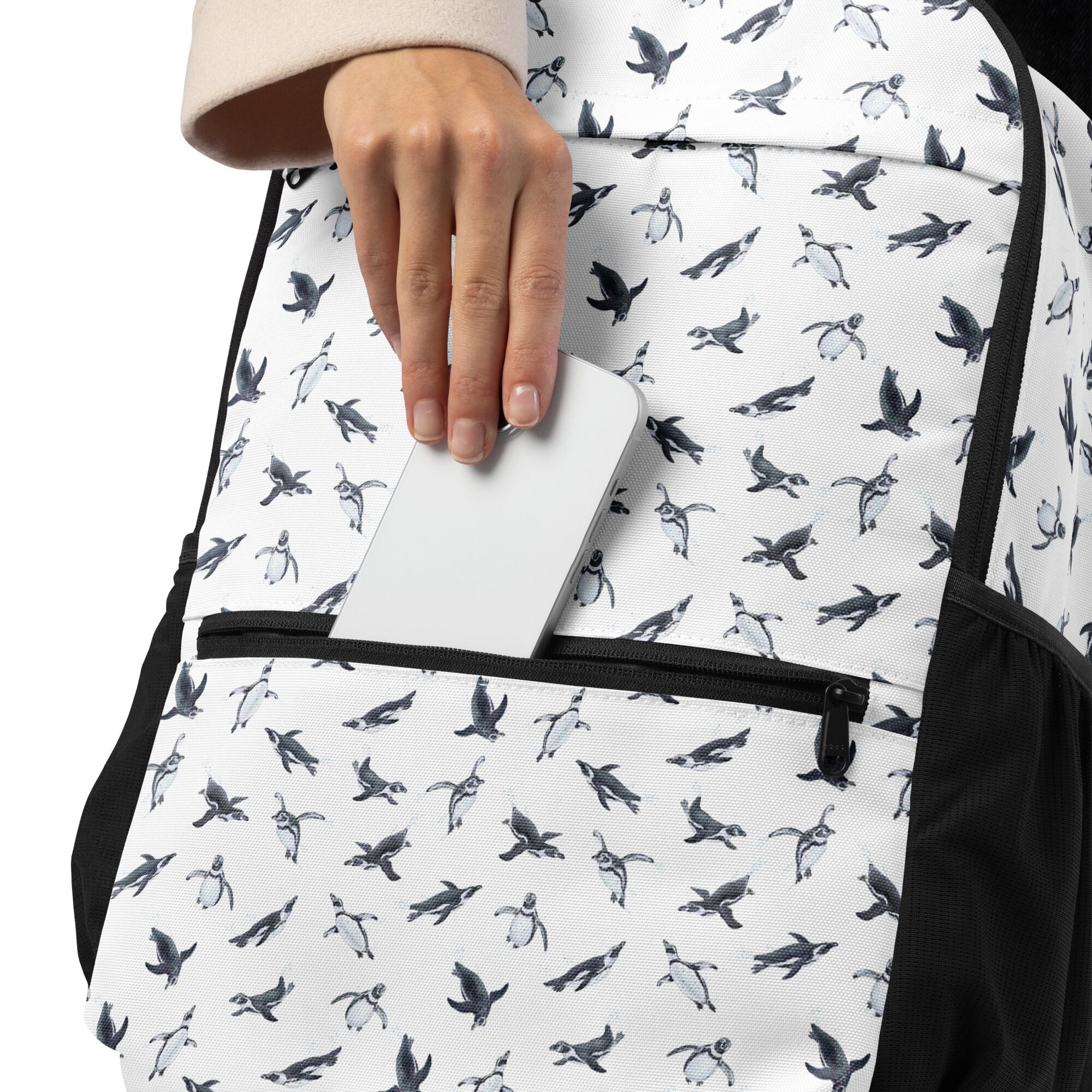 空を飛ぶように海中を游ぐペンギン柄のバックパックです。