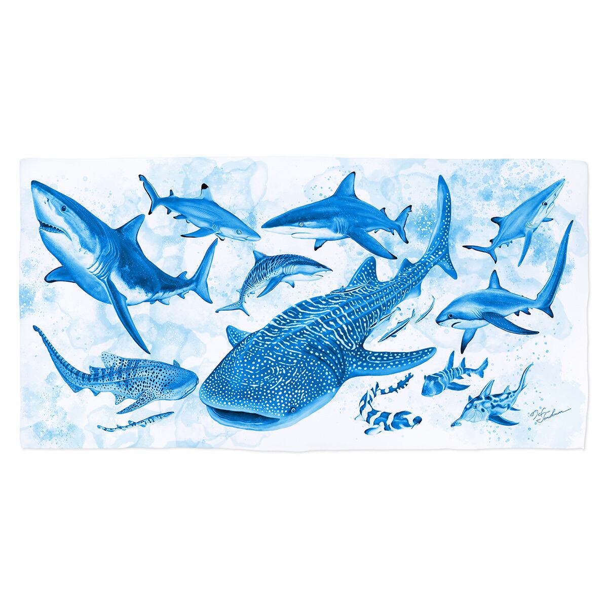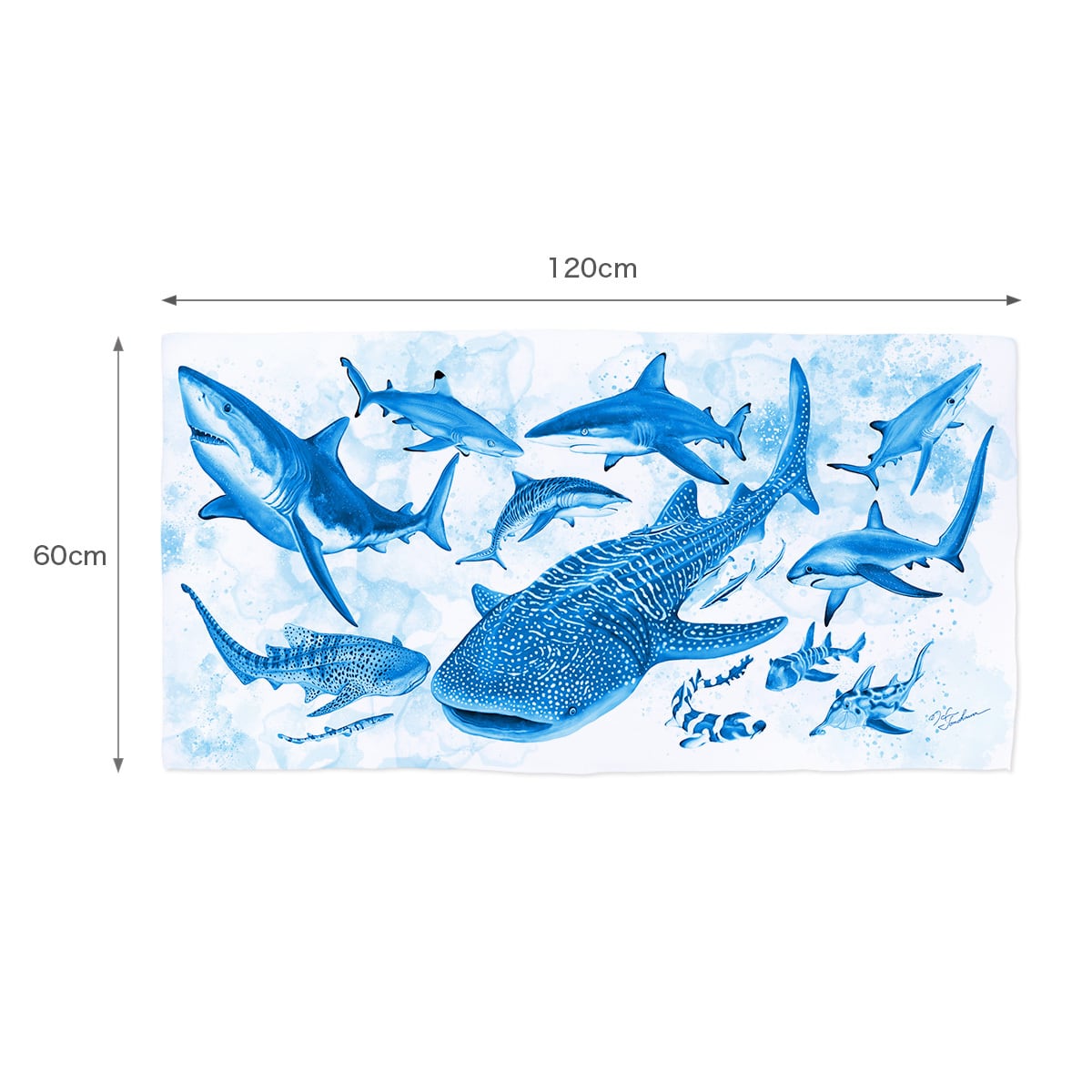 海の中をゆったりと泳ぐジンベエザメを中心に、さまざまなサメたちが集う海の情景をイメージした、おしゃれなバスタオルです。 タオルの表面はサラッとしたフラット織りのポリエステル生地、裏面は肌触りのやさしいふんわりした素材を使用した2層構造です。 【素材】 ポリエステル95%、ナイロン5% 【サイズ(cm)】 120×60 【注意点】 ※写真はイメージのため実物の色味は多少異なります。