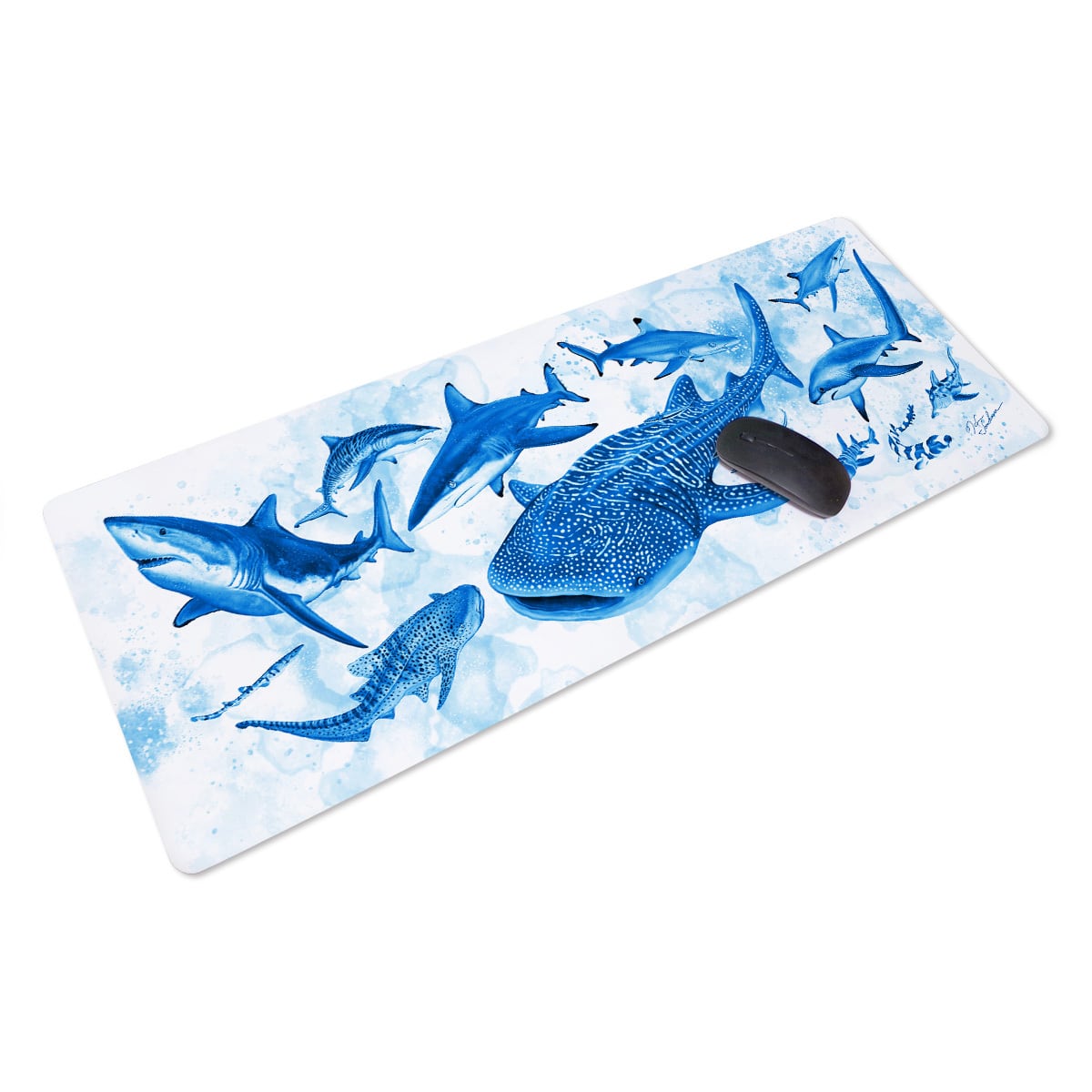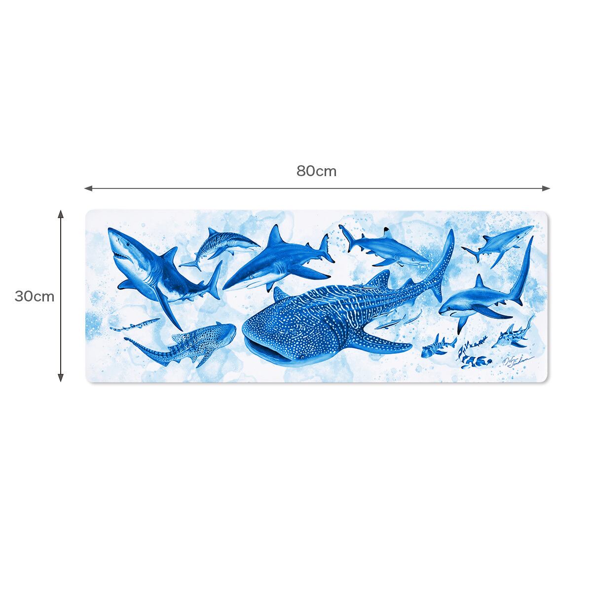 海の中をゆったりと泳ぐジンベエザメを中心に、さまざまなサメたちが集う海の情景をイメージした、おしゃれなデスクマットです。
