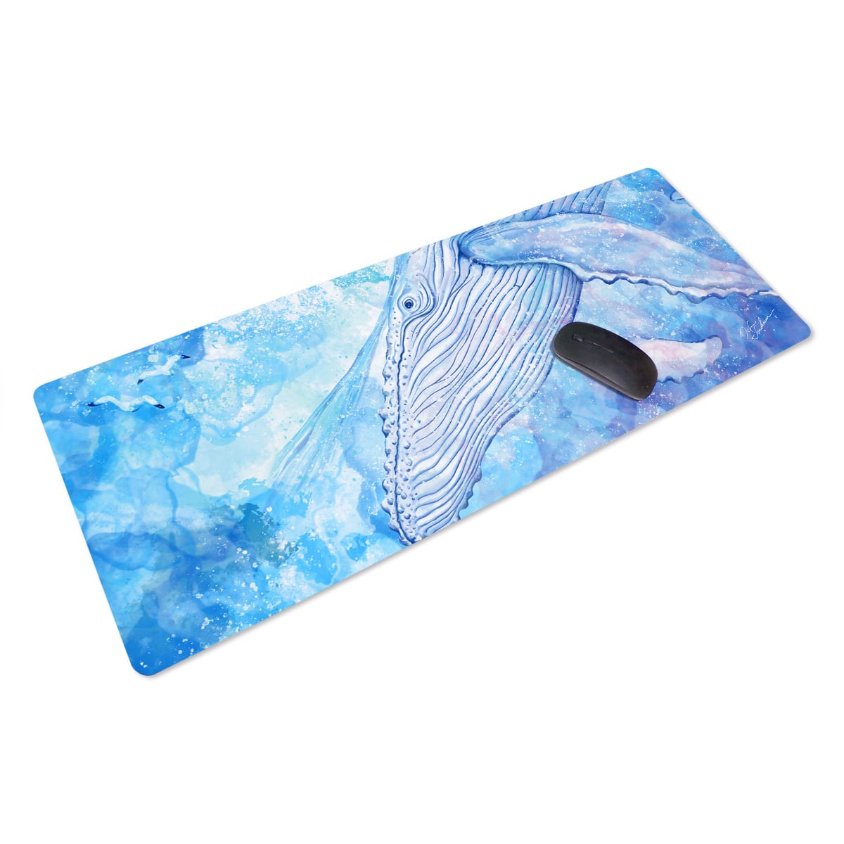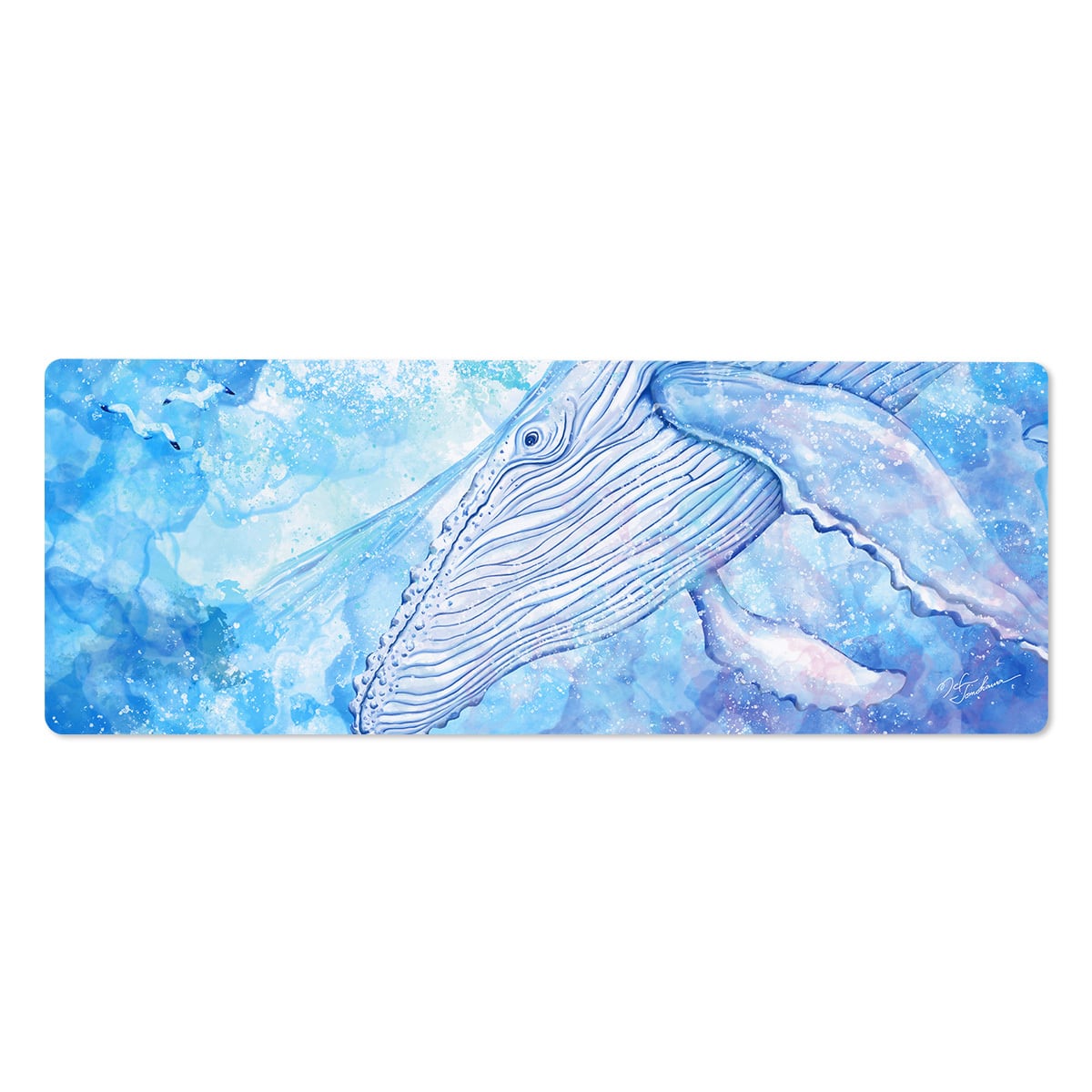 広大な青い海を泳ぐ白いクジラを描いたデスクマットです。