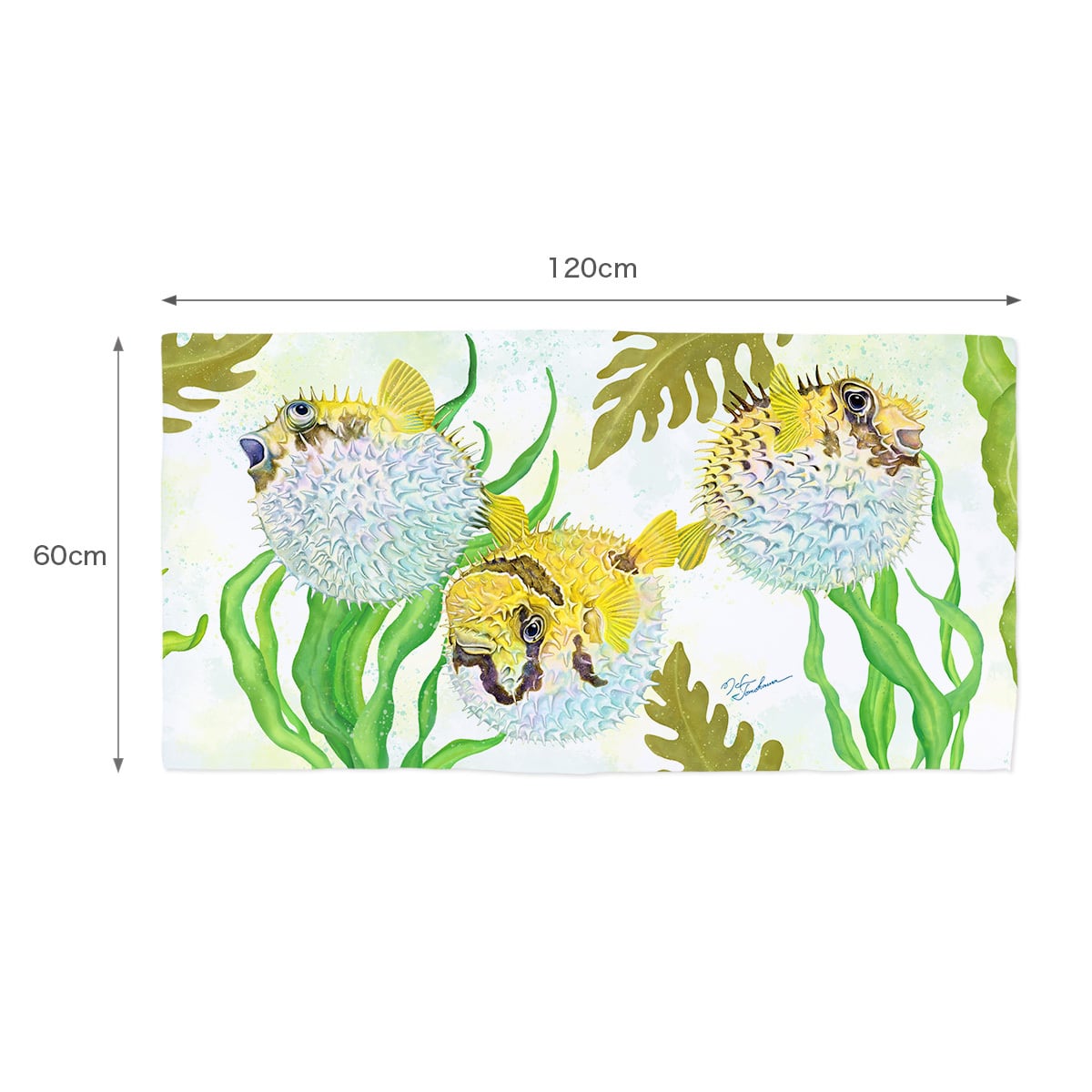ハリセンボンの仲良し3匹組を描いた、おしゃれでかわいいバスタオルです。 タオルの表面はサラッとしたフラット織りのポリエステル生地、裏面は肌触りのやさしいふんわりした素材を使用した2層構造です。 【素材】 ポリエステル95%、ナイロン5% 【サイズ(cm)】 120×60 【注意点】 ※写真はイメージのため実物の色味は多少異なります。