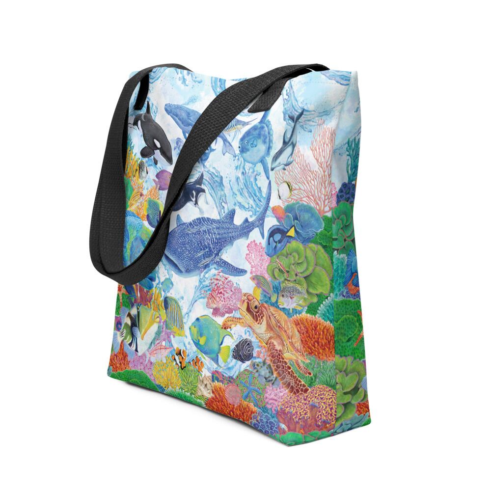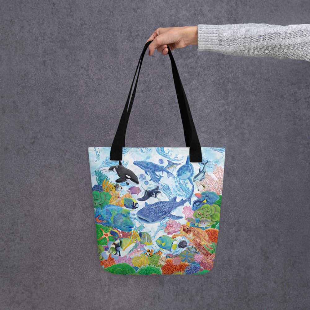 ジンベエザメ、ザトウクジラ、シャチ、マンボウなど、様々な海洋生物が集う楽園を描いたカラフルでインパクトのあるトートバックです。